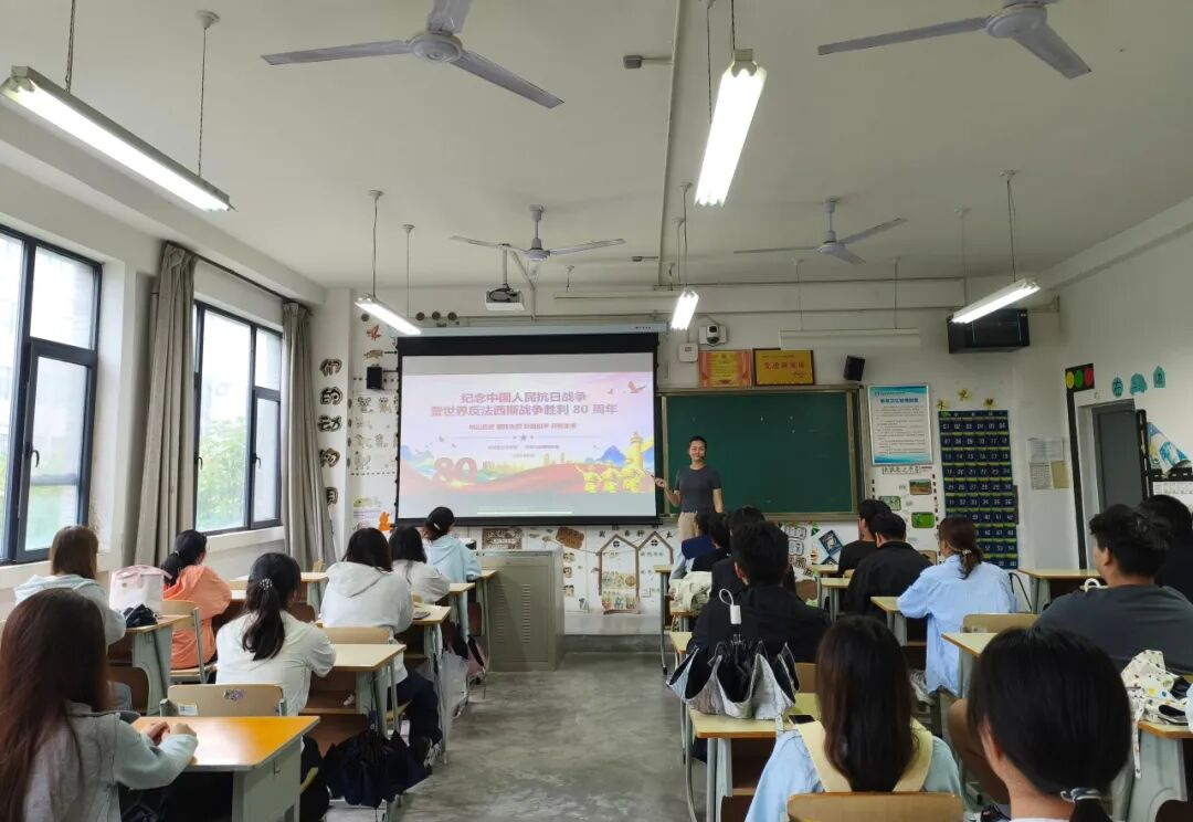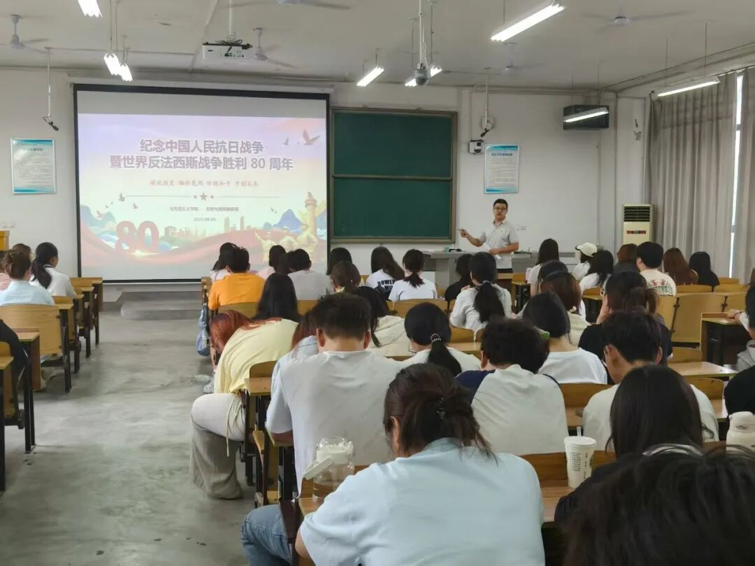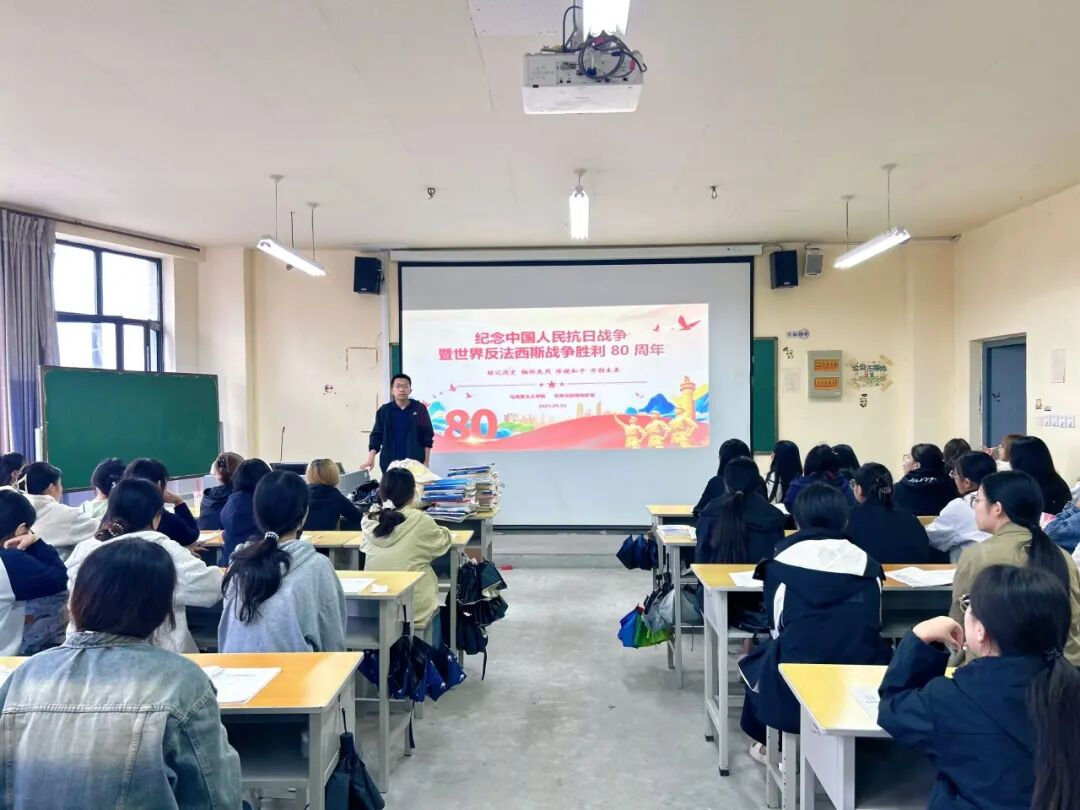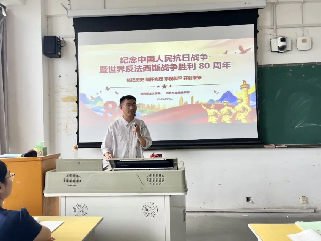 开展开学第一课主题宣讲活动。马克思主义学院形势与政策教研室于2025年9月2日至16日组织了“铭记历史 缅怀先烈 珍视和平 开创未来”主题宣讲活动。此次活动以校训“尚德、自强、乐业、创新”为内核,通过“理论溯源—主题研讨—精神升华”,引导9个二级学院、3000余名青年学子在历史回望中感悟信仰力量,在精神传承中践行校训真谛。活动通过“学—思—践—悟”闭环设计,使青年学子在历史与现实的对话中深化对抗战精神的时代认知,在实践与反思中激发投身民族复兴的奋进力量。