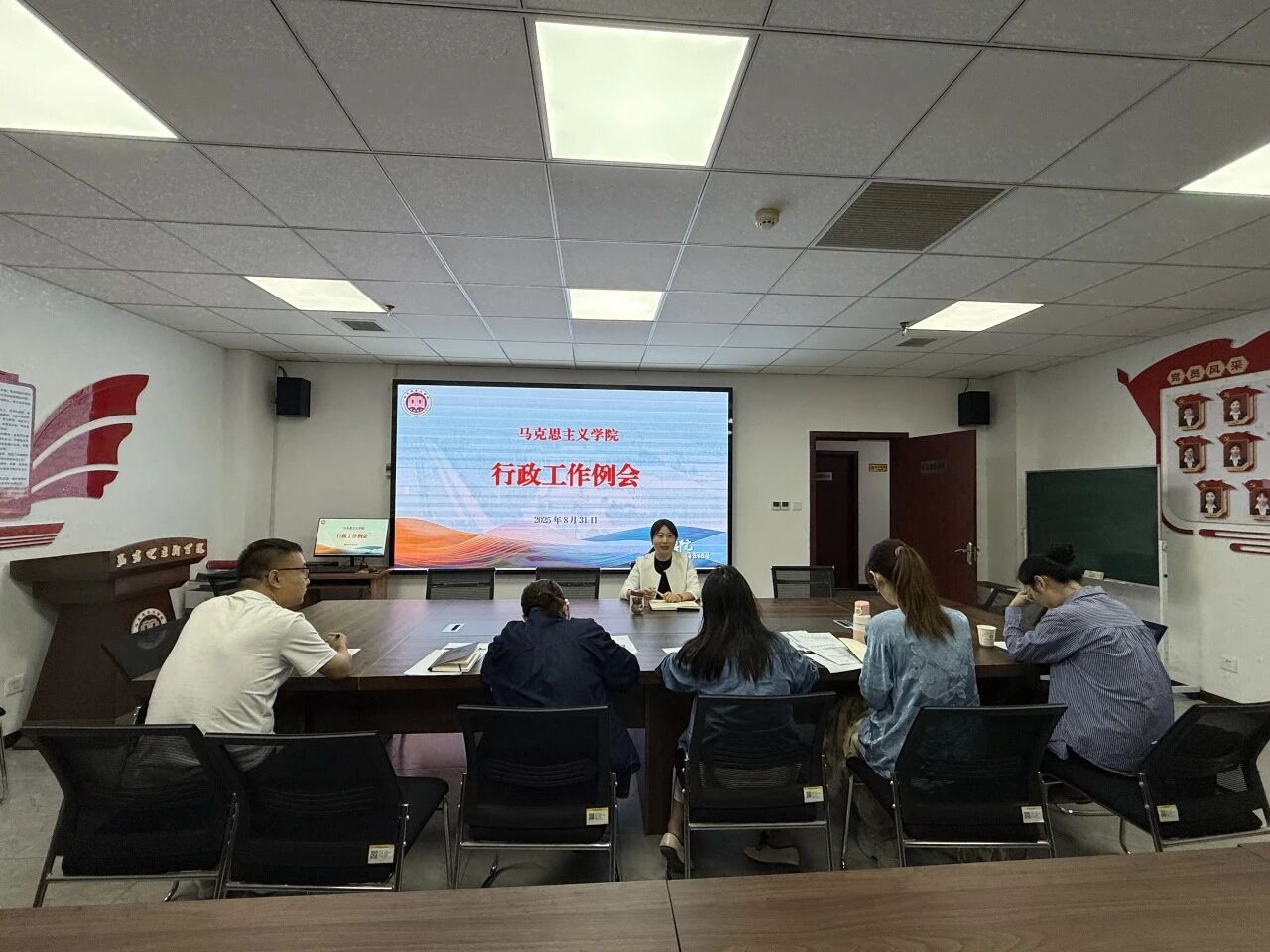 ——召开行政工作例会。2025年8月31日上午9点马克思主义学院在行政楼X-514会议室召开行政工作例会。会议由马克思主义学院院长尚云主持,全体行政人员和教研室主任参加会议。会上,与会人员依次汇报了暑假期间各项工作开展情况。尚云通报了暑假阶段重点工作的进展,并就新学期党务工作与教学工作进行研究部署,同时对开学准备工作作出具体安排。她强调,全体参会人员要凝心聚力,全力以赴保障2025年秋季学期各项工作高效有序推进。