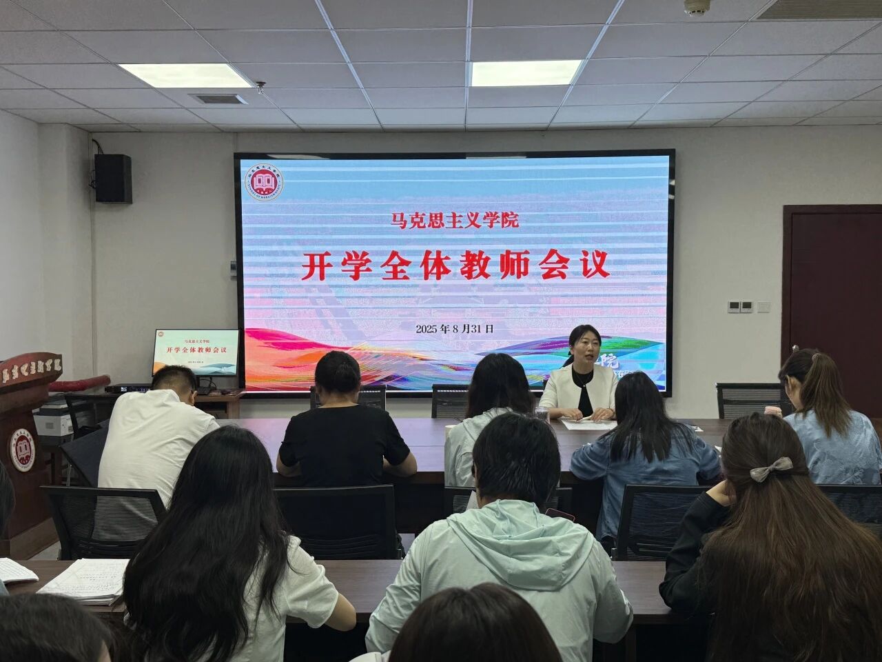 ——召开全体教师会议。2025年8月31日上午10点,马克思主义学院在行政楼X-514会议室开了全体教师会议。会议由马克思主义学院院长尚云主持,马克思主义学院全体专兼职教师参加会议。会上,尚云从党务工作、重点工作、特色亮点等方面系统回顾了马克思主义学院上半年工作,指出在全体思政课教师的共同努力下,圆满完成了2025年上半年的各项工作任务。围绕新学期工作,尚云作出具体部署,特别强调全体思政课教师要以饱满的精神状态迎接新学期、迈向新征程,扎实讲好“开学第一课”。同时,她寄语全体教师要坚守教育初心,筑牢课堂主阵地;增强机遇意识,聚合优势提升质效;凝聚奋进合力,共绘发展新蓝图。