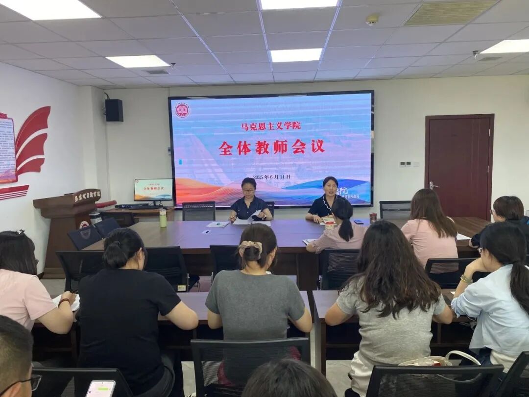 6月11日,马克思主义学院在行政楼X-513会议室召开全体教职工大会。会上集体学习了教育领域专项整治工作方案,就深入贯彻中央八项规定精神学习教育集中整治工作作了进一步安排部署,解读了科研诚信建档专项工作,传达了学院期末考试工作方案,对期末相关工作进行了要求,就大学生红色全景资源创意展示评选活动进行了部署与安排。会议要求:全体思政课教师要坚持政治引领,筑牢思想根基,将学习贯彻中央八项规定精神与师德师风建设有机统一,把政治标准和政治要求贯穿教育教学全过程;聚焦主责主业,提升育人实效,守好课堂教学“责任田”,充分发挥思政课立德树人主渠道作用,持续提升课堂教学质量;凝聚发展合力,共创美好未来,培育团结协作、公平公正的学院文化,打造特色鲜明的教学科研品牌,推动学院内涵式发展。