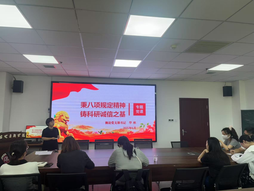 为深入贯彻中央八项规定精神学习教育,扎实推进科研诚信建设,6月18日,概论党支部组织开展“秉中央八项规定精神 铸科研诚信之基”专题党课学习活动,支部书记华欣主讲,全体党员参与学习。