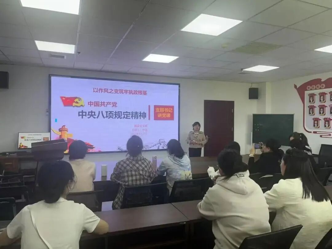 2025年4月23日,马克思主义学院开展深入贯彻中央八项规定精神学习教育。思想道德与法治党支部书记李琨和概论党支部书记华欣分别以“中央八项规定:新时代的徙木立信之举”“深入解读中央八项规定精神——以作风之变筑牢执政根基”为主题,为全院党员教师作专题辅导。