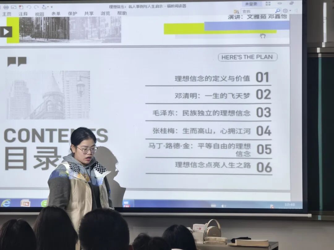 此次实践教学中,学生通过主题PPT演讲、原创短视频制作及诗歌朗诵等富有创造力的方式,生动讲述了理想信念的科学内涵、时代价值及其对个人成长成才、国家民族发展的重大意义;通过多样化的艺术形式,促使学生将抽象的理想信念理论转化为具体、生动的情感体验和价值追求,增强对马克思主义信仰、共产主义远大理想和中国特色社会主义共同理想的认同;培养学生的团队协作能力、创新思维、艺术表达能力和信息技术应用能力,实现知识传授、能力培养与价值引领的有机统一;为学生提供展示才华、交流思想的平台,展现新时代青年学子积极向上、勇于担当的精神风貌,激发为中华民族伟大复兴中国梦而奋斗的青春力量。马克思主义学院院长尚云表示,本次实践教学活动是为激发学生学习的主动性和创造性,真正将理论知识融入心灵,在实践中坚定理想信念,锤炼高尚品格,展现新时代大学生的卓越风采!马克思主义学院将持续推进“思政小课堂”与“社会大课堂”相结合,构建“行走的思政课”实践教学机制,引导广大学子在实践中淬炼青春,在奋斗中书写华章。