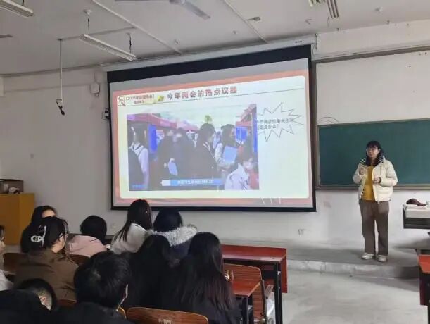 教研室老师们以《政府工作报告》为核心,聚焦“教育强国”“科技创新”“人口高质量发展”等关键词,通过政策图解和代表之声,系统阐释国家战略部署与青年使命的关联性。通过结合两会提出的“深化产教融合”要求,引导学生思考专业发展与国家需求的契合点;围绕“绿色转型”议题,帮助学生理解“双碳”目标下的青年责任。