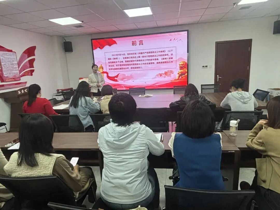 2025年10月9日,马克思主义学院概论党支部与思想道德与法治党支部联合开展“迎国庆 强使命”十月主题党日活动。学院党总支书记尚云就《中国共产党思想政治工作条例》作专题党课辅导,全体党员重温了《中国共产党章程》相关内容,并围绕“将理论学习成果转化为教育教学实践”展开深入研讨。学院将以此次活动为契机,持续加强理论学习和队伍建设,推动思想政治教育工作提质增效。