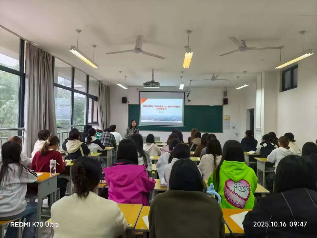 2025年10月15日,汉中职业技术学院学工处、团委在“一站式”学生社区党员活动室联合举办了题为“传承抗战精神,筑牢育人根基”的专题学习讲座。活动邀请马克思主义学院张宇晴副教授担任主讲,学工处、团委全体党员干部参加了学习。张宇晴老师在讲座中系统阐释了抗战精神的四大内涵,强调其具有跨越时空的育人价值。她围绕“信念、担当、情怀”三个关键词指出,育人者须筑牢精神堡垒、保持战斗姿态、坚守爱生初心,将抗战精神转化为做好学生工作的动力。整场讲座理论联系实际,引发全体党员干部深刻共鸣。