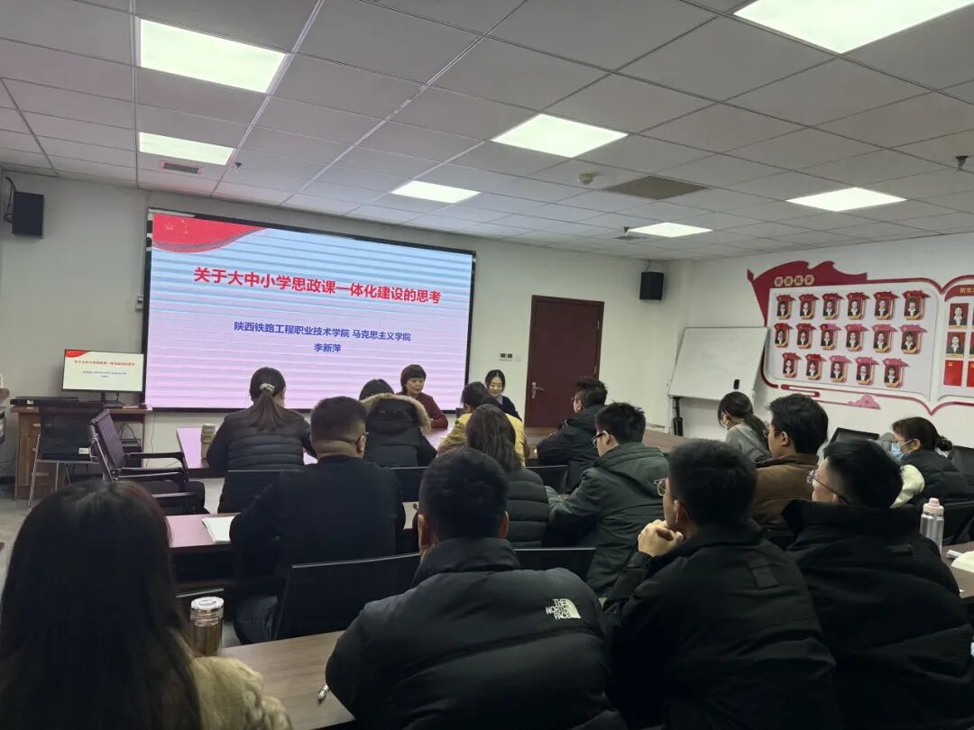12月22日,教育部高等学校思想政治理论课教学指导委员会委员、陕西铁路工程职业技术学院马克思主义学院院长、汉中职业技术学院“大思政课”实践导师李新萍教授应邀到马克思主义学院,在行政楼X-513会议室作题为“大中小学思政课一体化建设”的专题讲座。马克思主义学院全体专兼职思政课教师参会,综合办主任刘璇主持。