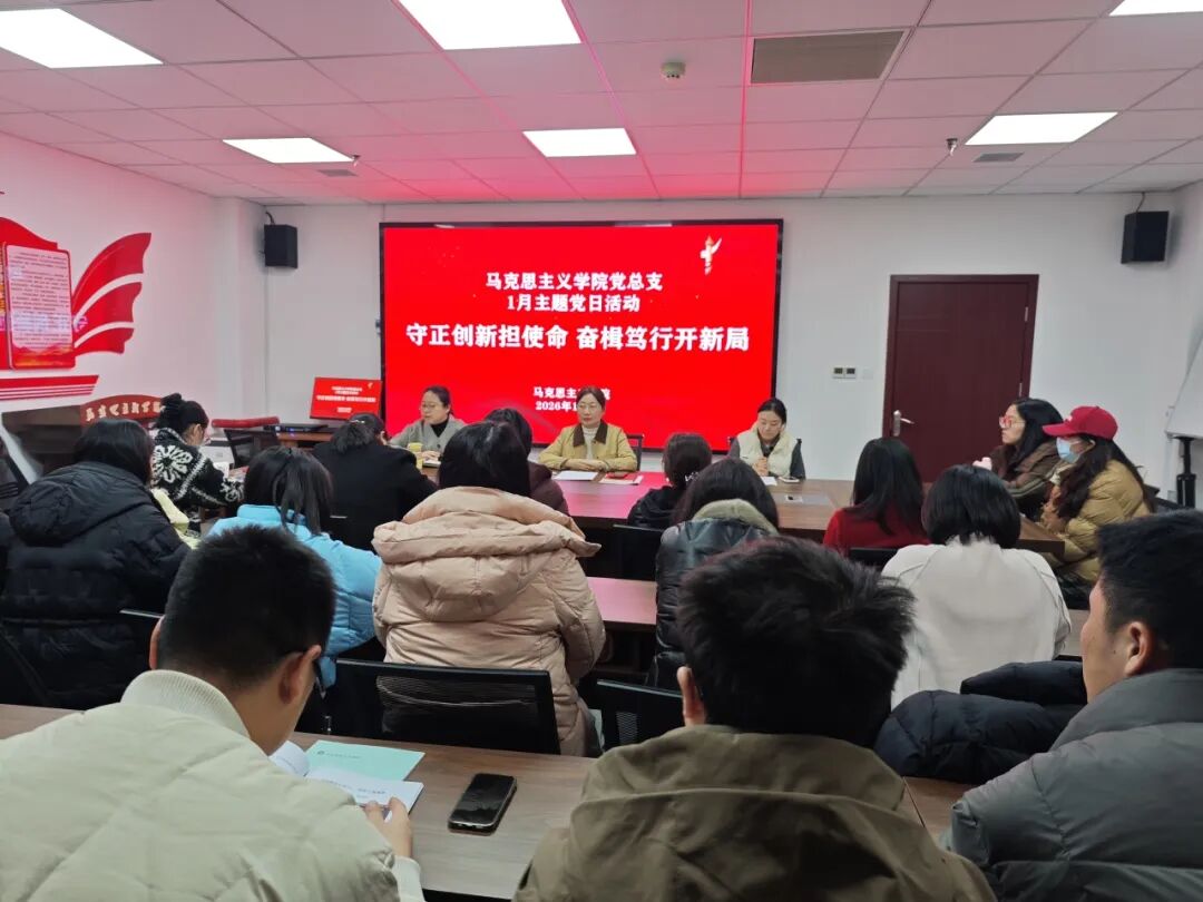 为深入贯彻落实学院党委工作部署,凝聚党员教师奋进力量,推动党建与思政教育深度融合,2026年1月7日,马克思主义学院党总支在行政楼513室举办“守正创新担使命 奋楫笃行开新局”1月主题党日活动,全体党员教师参会。