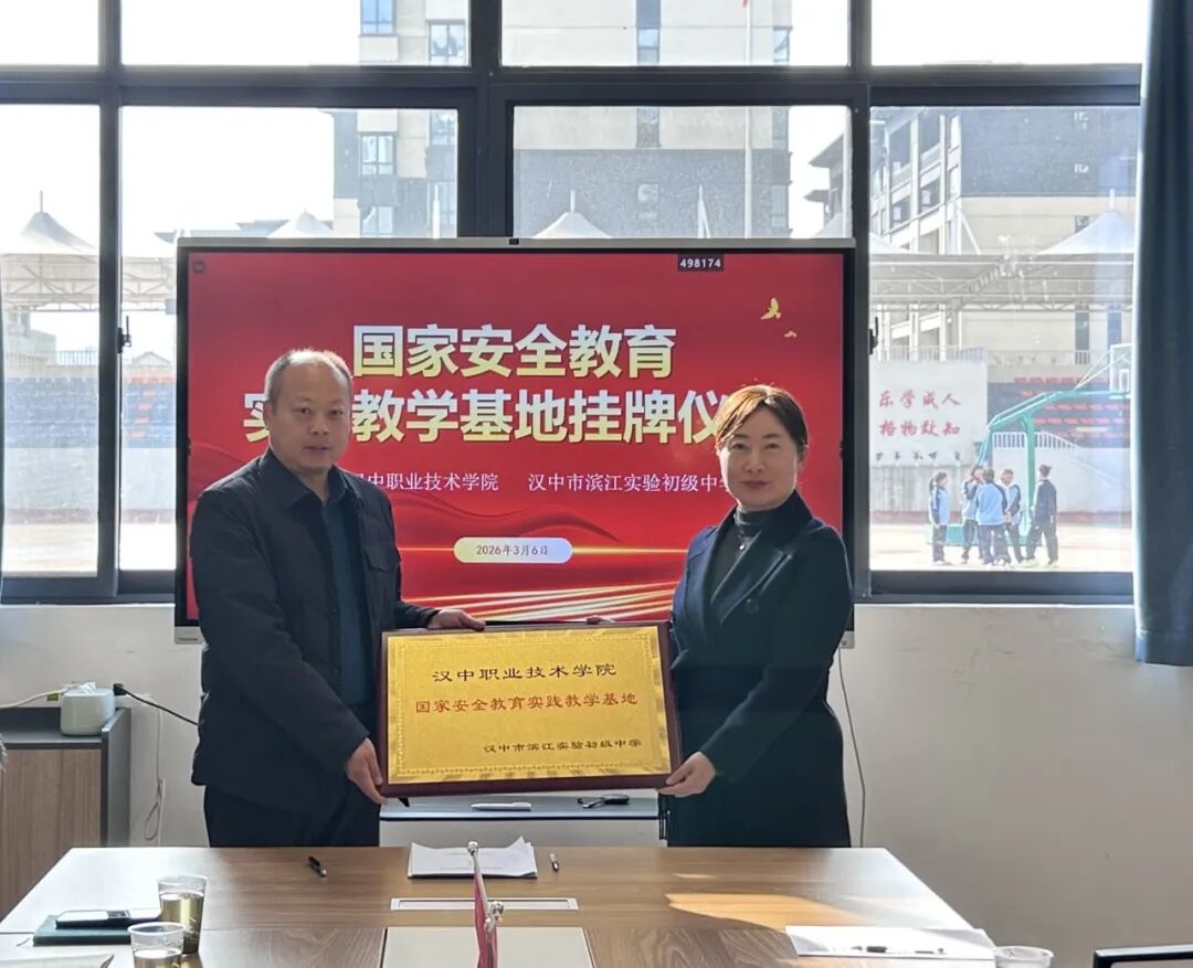 2026年3月6日下午,汉中职业技术学院在汉中市滨江实验初级中学举行“国家安全教育实践教学基地”挂牌活动。汉中职业技术学院马克思主义学院院长尚云、继续教育学院院长冯晓敏,汉中市滨江实验初级中学校长杨杰、副校长王鹏飞及两校师生代表共同参加。