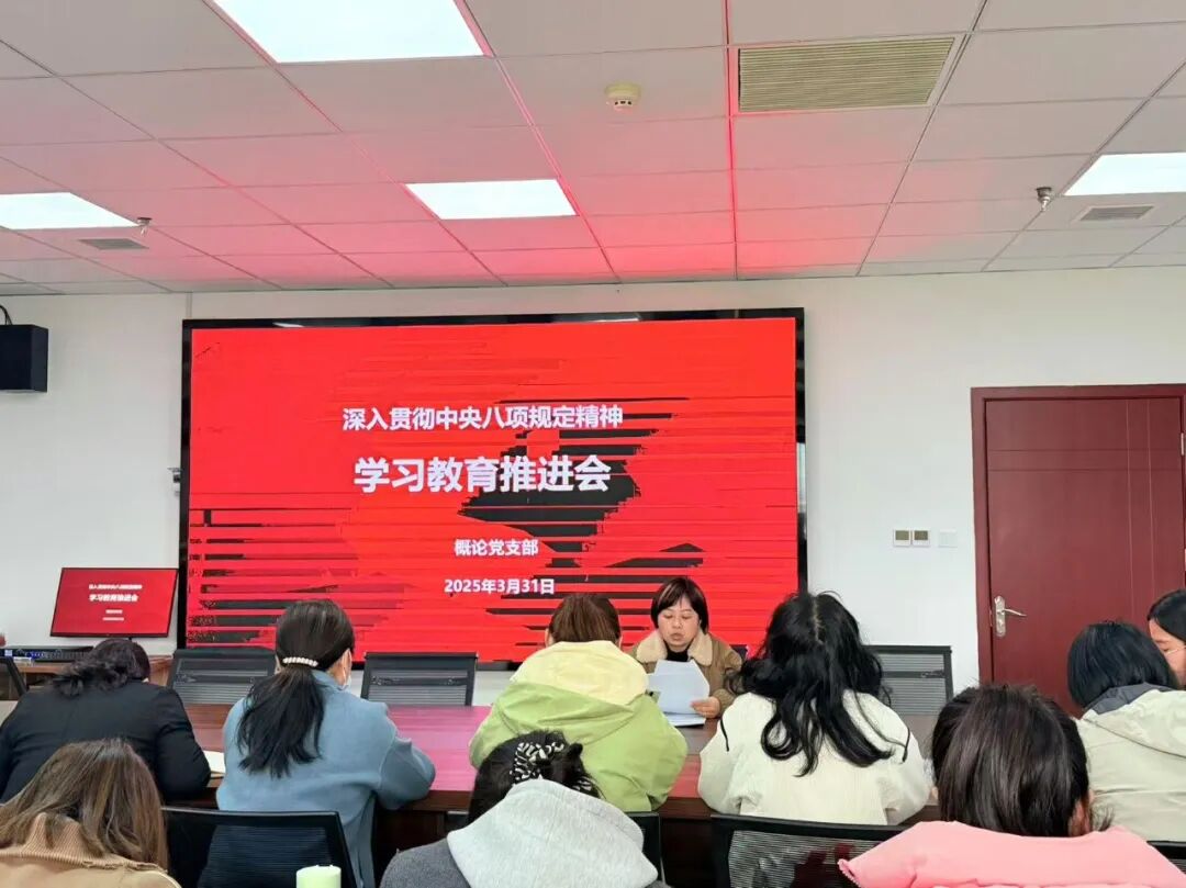 2025年3月31日,马克思主义学院概论党支部和思想道德与法治党支部在行政楼X-513会议室召开党员大会,开展深入贯彻中央八项规定精神学习教育工作。全体党员教师参会。